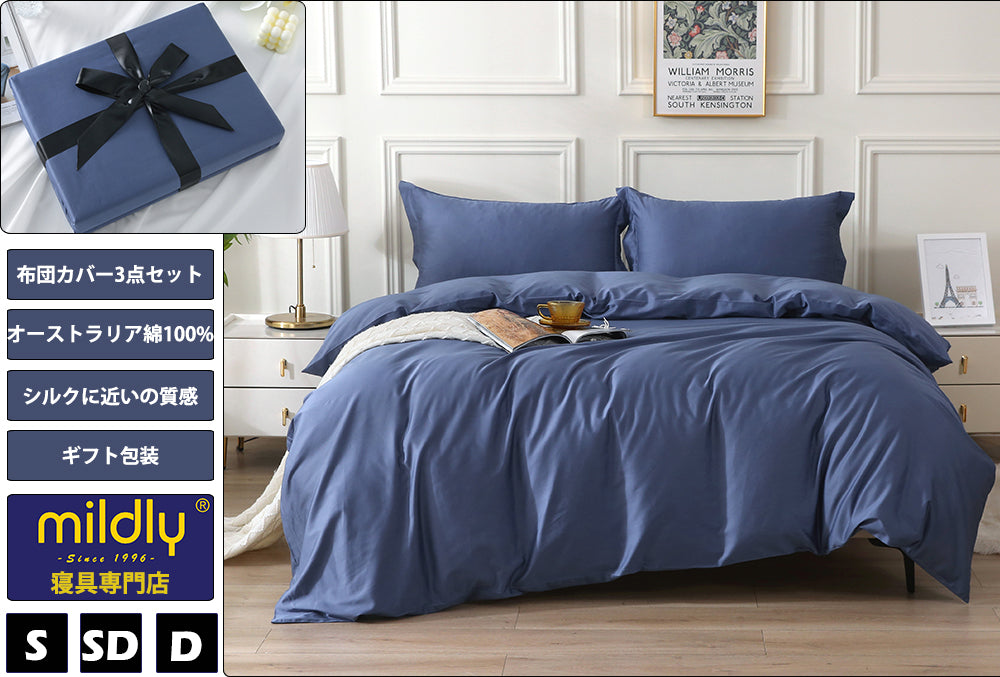 MILDLY 【単品:枕カバー/掛け布団カバー/ボックスシーツ】【3点セット:枕カバー2枚組+掛ふとんカバー】まくらカバー:43x63cm/50x70cm 2枚組┃ 掛ふとんカバー┃ボックスシーツ シングル/セミダブル/ダブル オーストラリア綿100% ホテル仕様 サテン調 おしゃれ 柔らかい さらさら肌触り 吸汗 速乾 【紫色/ベージュ/ホワイト/グレー/ネイビー】
