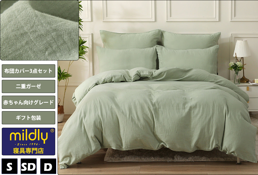 布団カバー 3点セット 赤ちゃんでも使える品質 コットン二重ガーゼ MILDLY 布団カバーセット 【枕カバー2枚 + 掛け布団カバー1枚】(シングル/セミダブル/ダブル)(ホワイト/薄緑色/グレージュ/グレー)
